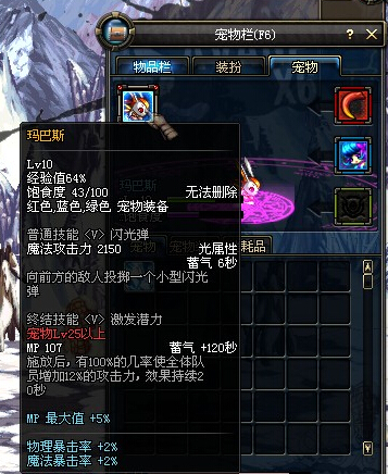 dnf玛巴斯可不是像所罗门魔神玛巴斯拥有雄狮的魁梧风姿,dnf玛巴斯以金黄色兔子来和玩家见面,可不能小看这只兔子,它的激发潜力能增加己方10%的攻击力,50级的玛巴斯可以增加20%攻击力,很给力的宠物有没有?可爱却不失霸气!