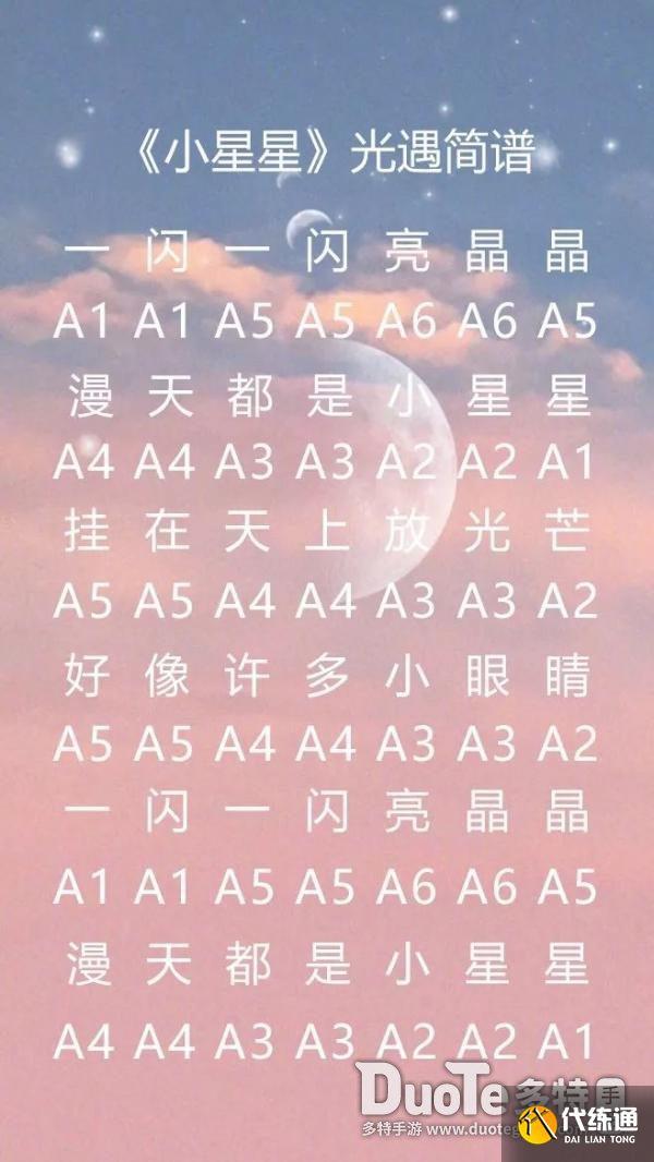 当前位置: 首页 游戏攻略 正文 光遇小星星乐谱_sky光遇乐谱小星星 V 布衣战神 管理员 / 159 阅读 / 2026-03-22 18:10 在光遇游戏中,玩家们能够弹奏出各种各样自己喜欢的乐曲,下面就一起来看看其中的小星星乐谱分享吧,感兴趣的小伙伴千万不要错过哦。 光遇小星星琴谱 把琴键按音高划分为A、B、C三组数字1至7对应Do到Si 编号对应表见下图 具体完成版乐谱见下图 参考视频攻略 以上就是光遇小星星琴谱分享了,希望这篇文章能够对看到这里的你有所帮助 本站发布的资源进攻学习研究只用,请勿用于商业用途,否则其后果由使用者本人承担,本站不承担任何后果