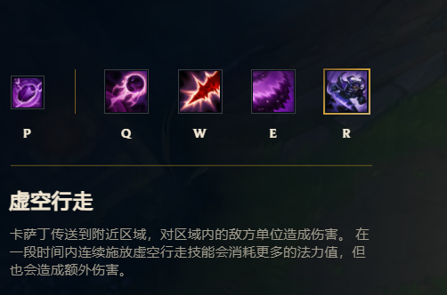 虚空行走:卡萨丁传送到附近的目标区域,着陆时对身边的所有敌方单位造成魔法伤害。 每在15秒内连续施放一次虚空行走,法力消耗就会翻倍,每层效果造成额外魔法伤害,最多可叠加4层。